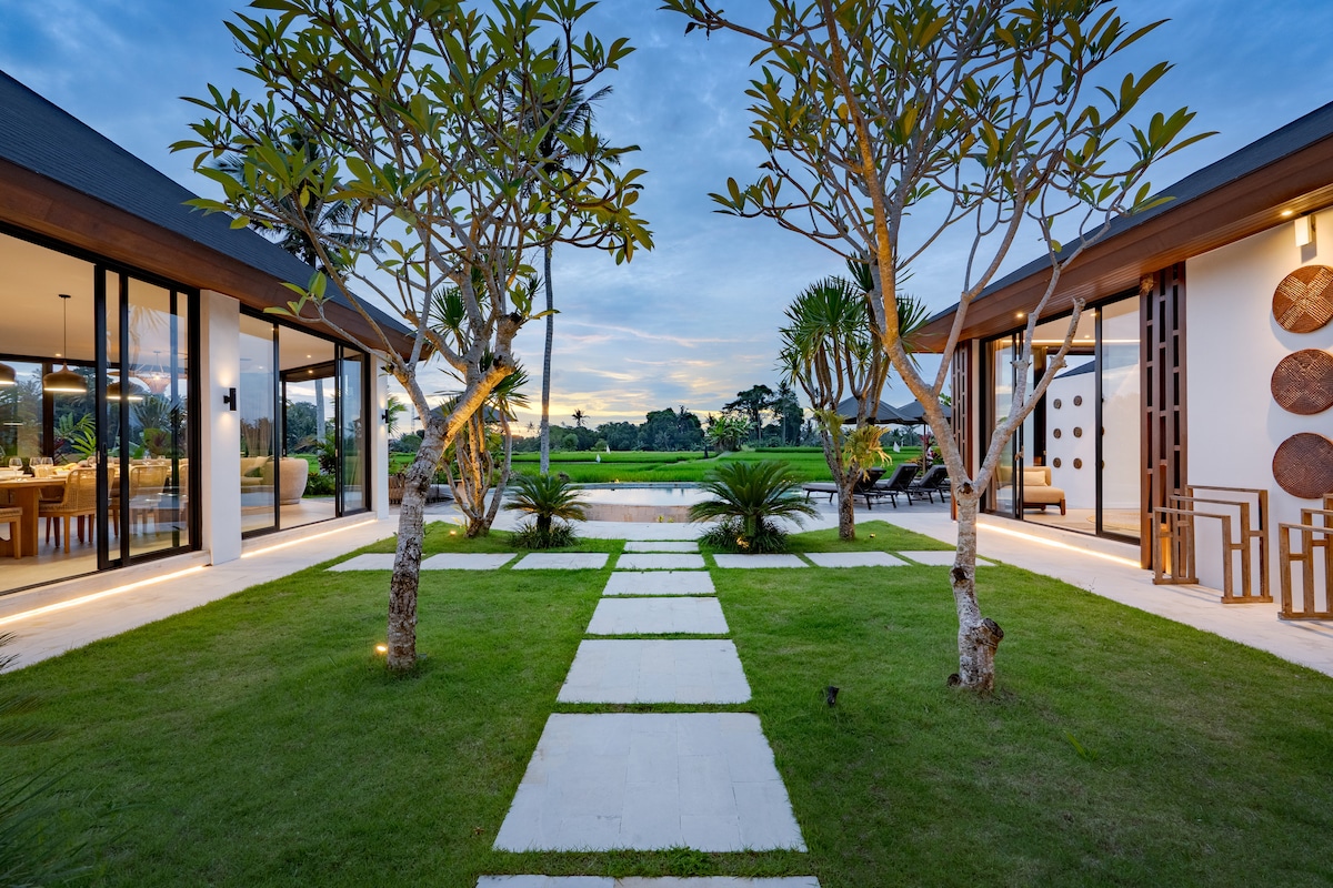 Shoot wide-angle backyard overview during golden hour with all outdoor lighting on, showing rice field views, pool area, and landscaping in one dramatic composition