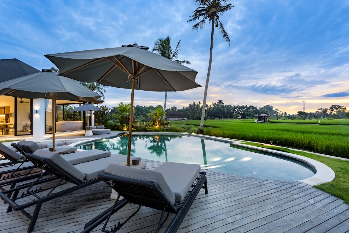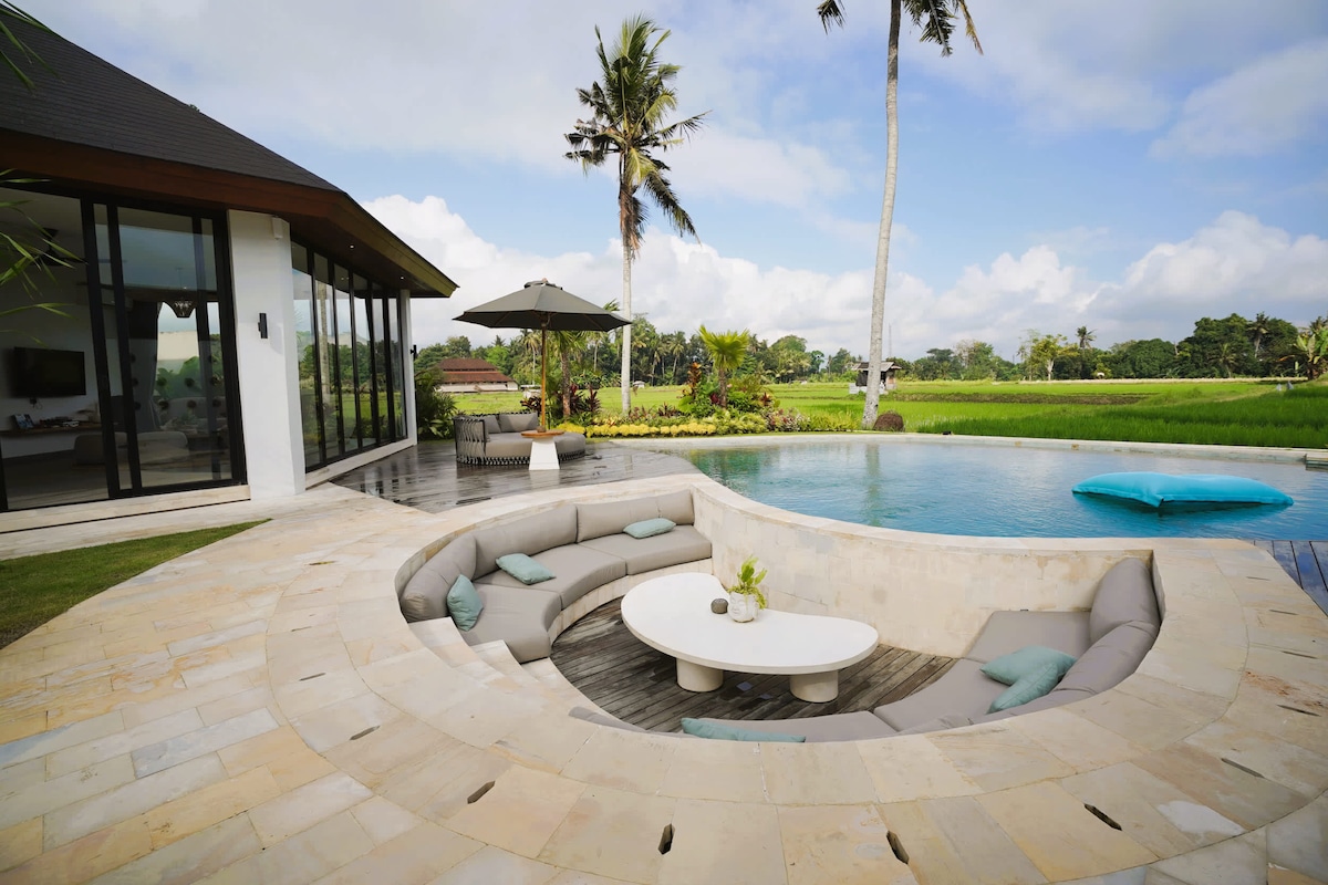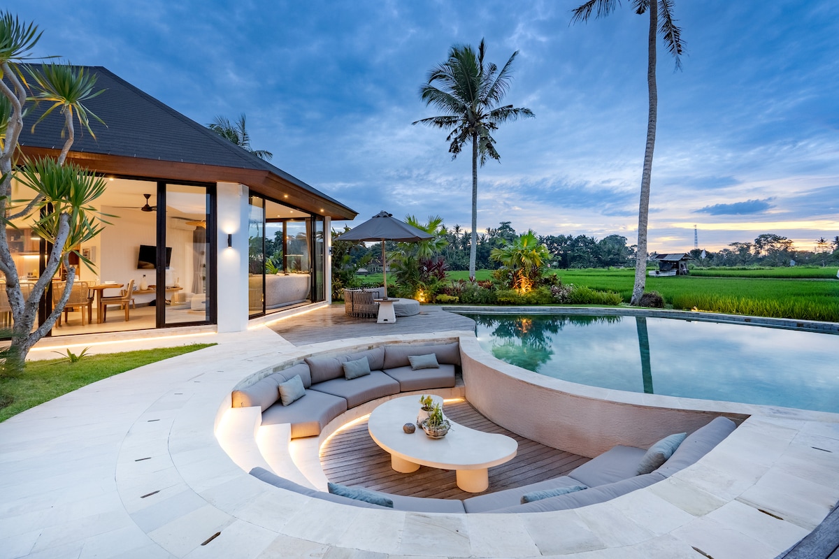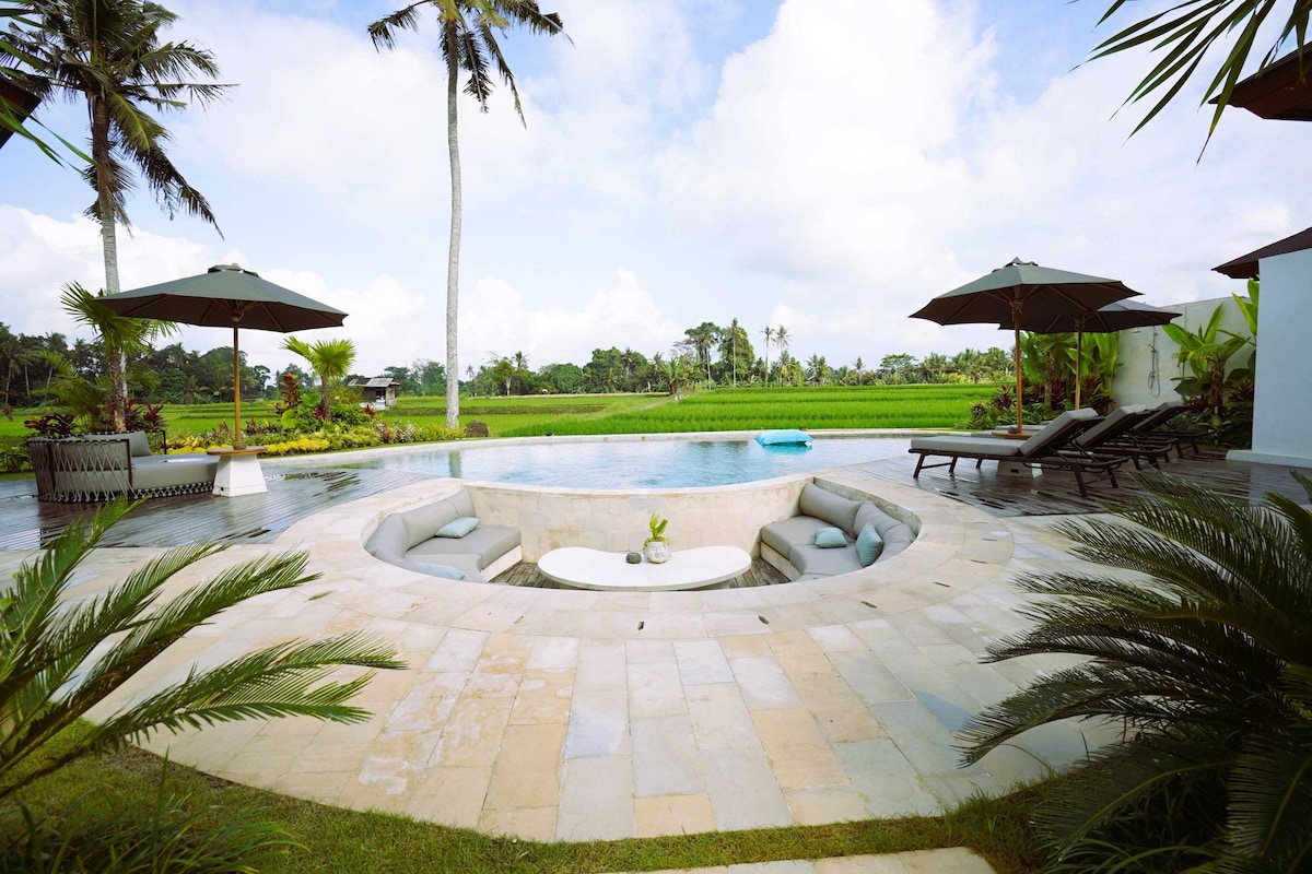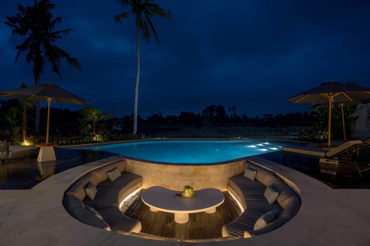 Exceptional pool photography with professional composition and lighting variety from day to night. The infinity pool with rice field views and unique sunken conversation pit create strong visual appeal. While technically excellent, the photos could benefit from more luxury lifestyle staging and intimate tropical atmosphere like top performers.