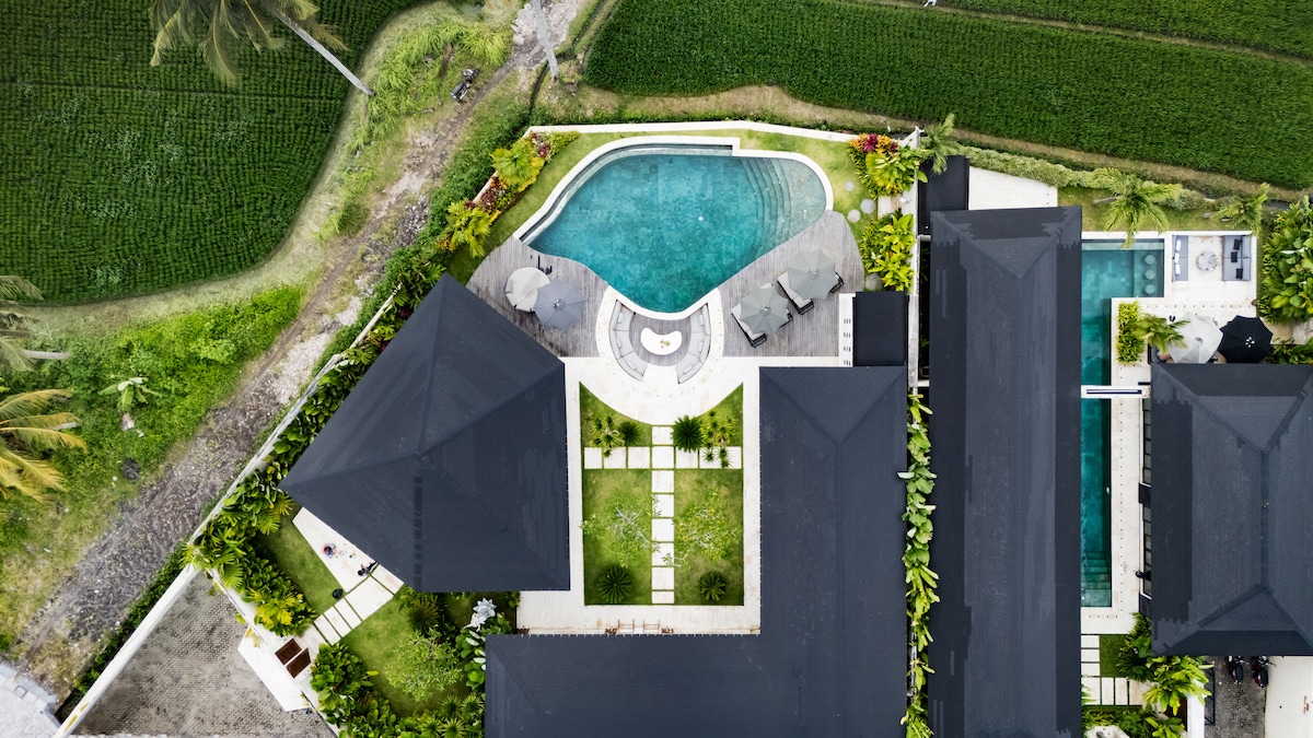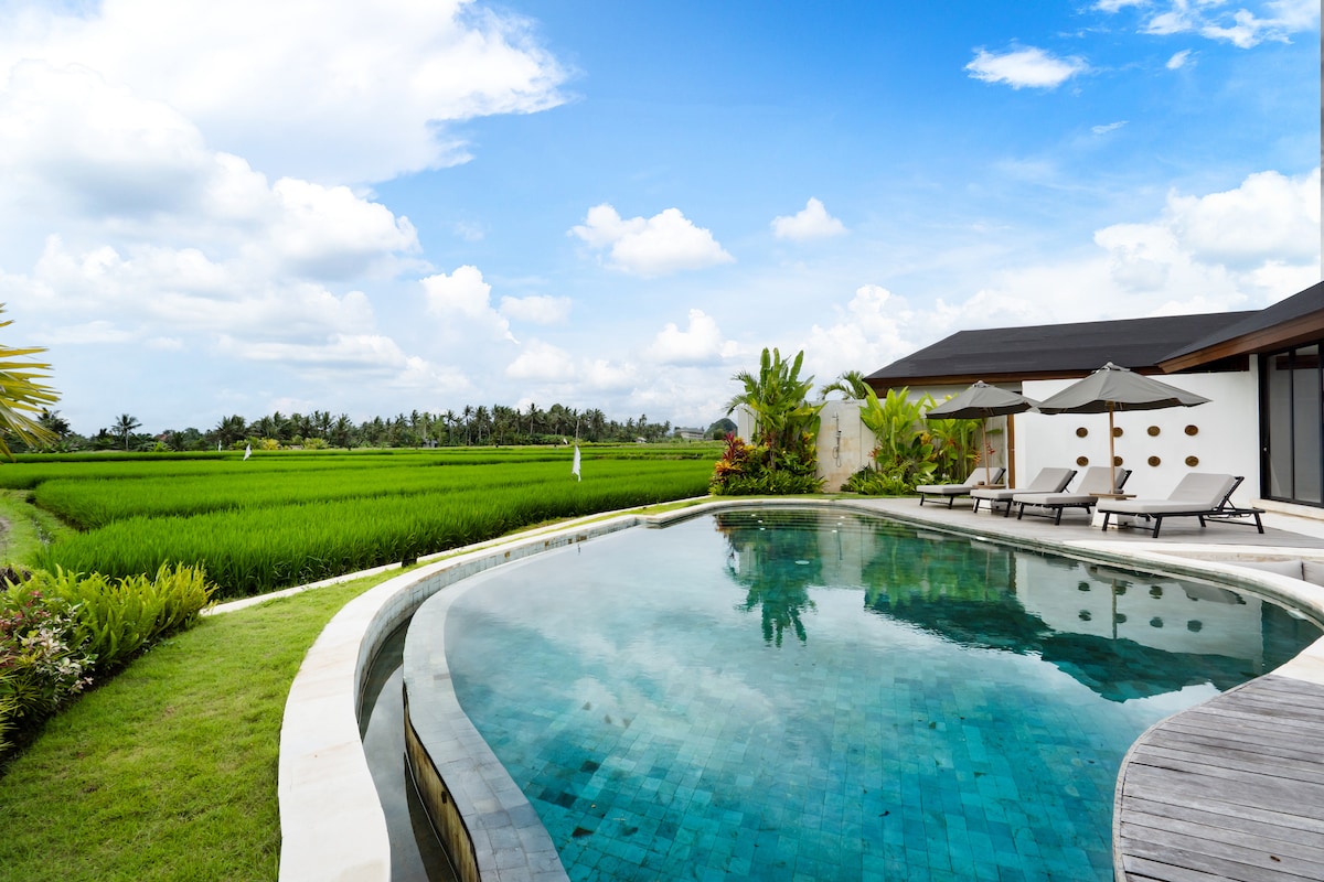 Capture more pool-integrated shots that include both water features and rice field views in single frames