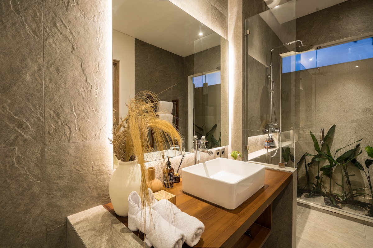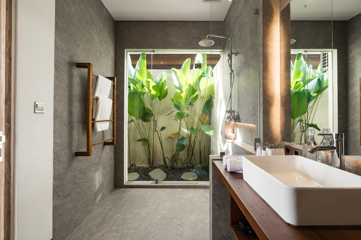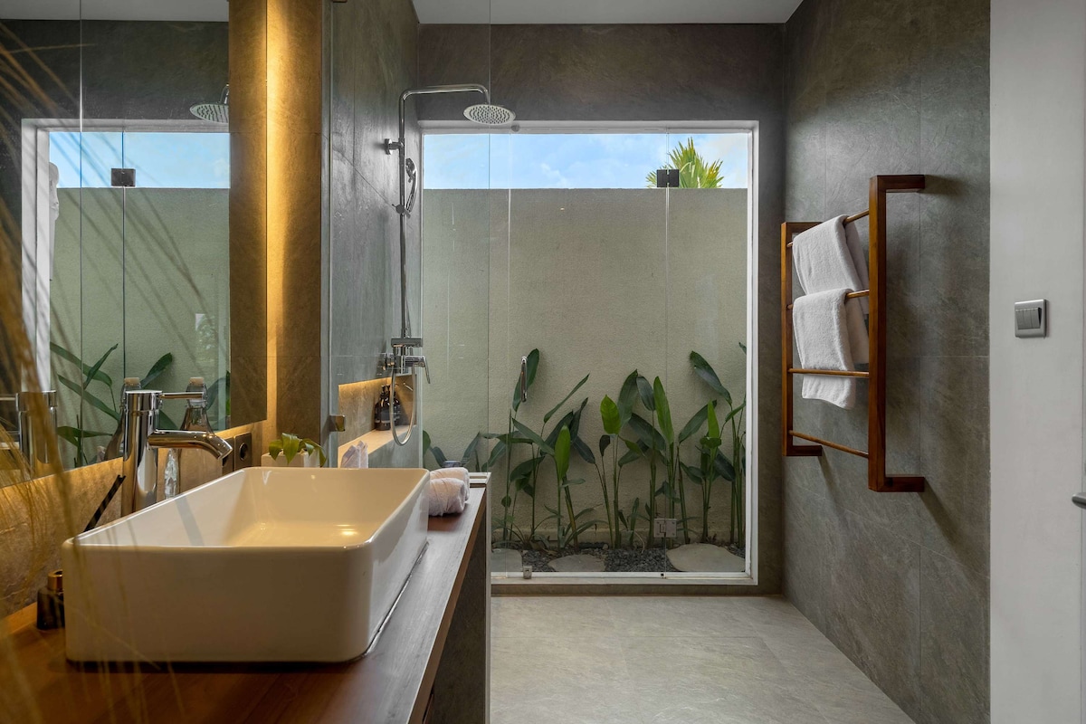 Villa Vidrev's bathroom photos are exceptionally strong with modern luxury finishes, great lighting, and tropical garden views. The freestanding tub and contemporary design compete well with top performers, though some shots could benefit from wider angles and more dramatic garden integration.