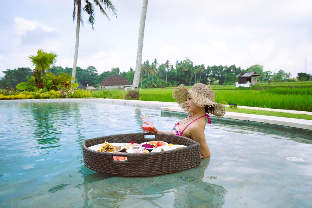 Add floating breakfast tray or poolside dining elements to create lifestyle appeal