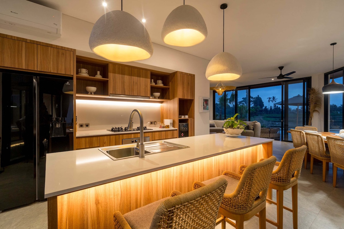 Add warm evening lighting and stage with fresh fruit, coffee cups, or breakfast items on the counter