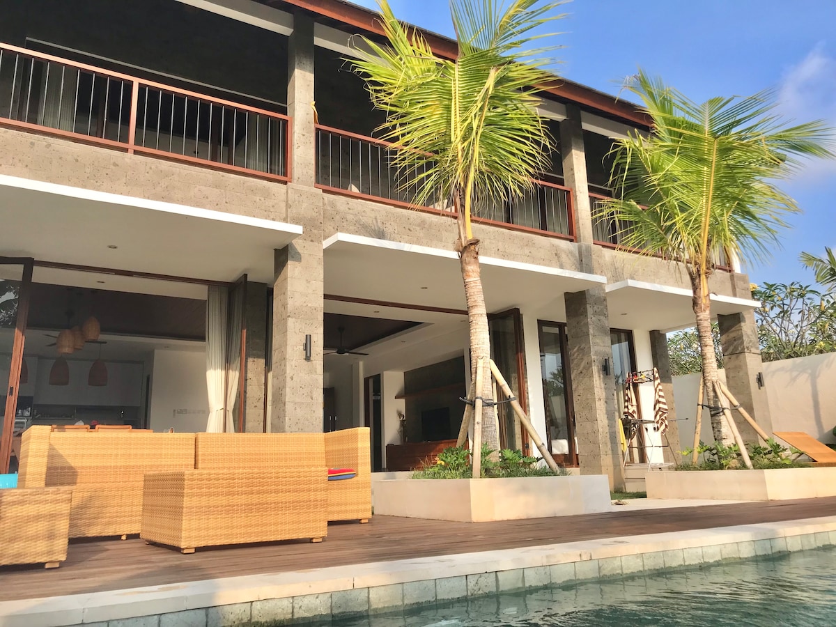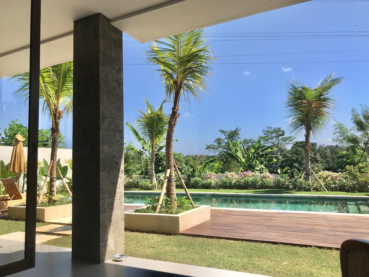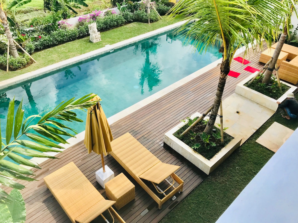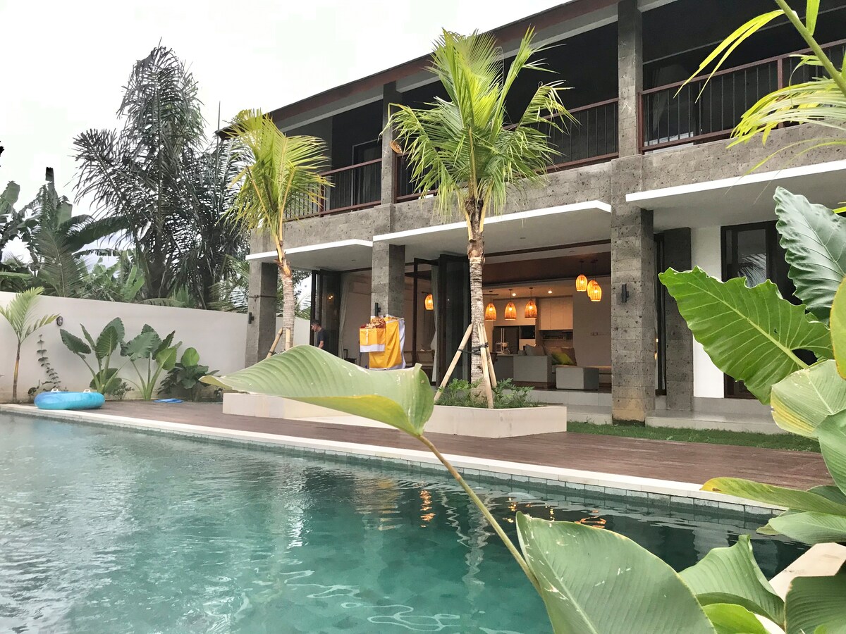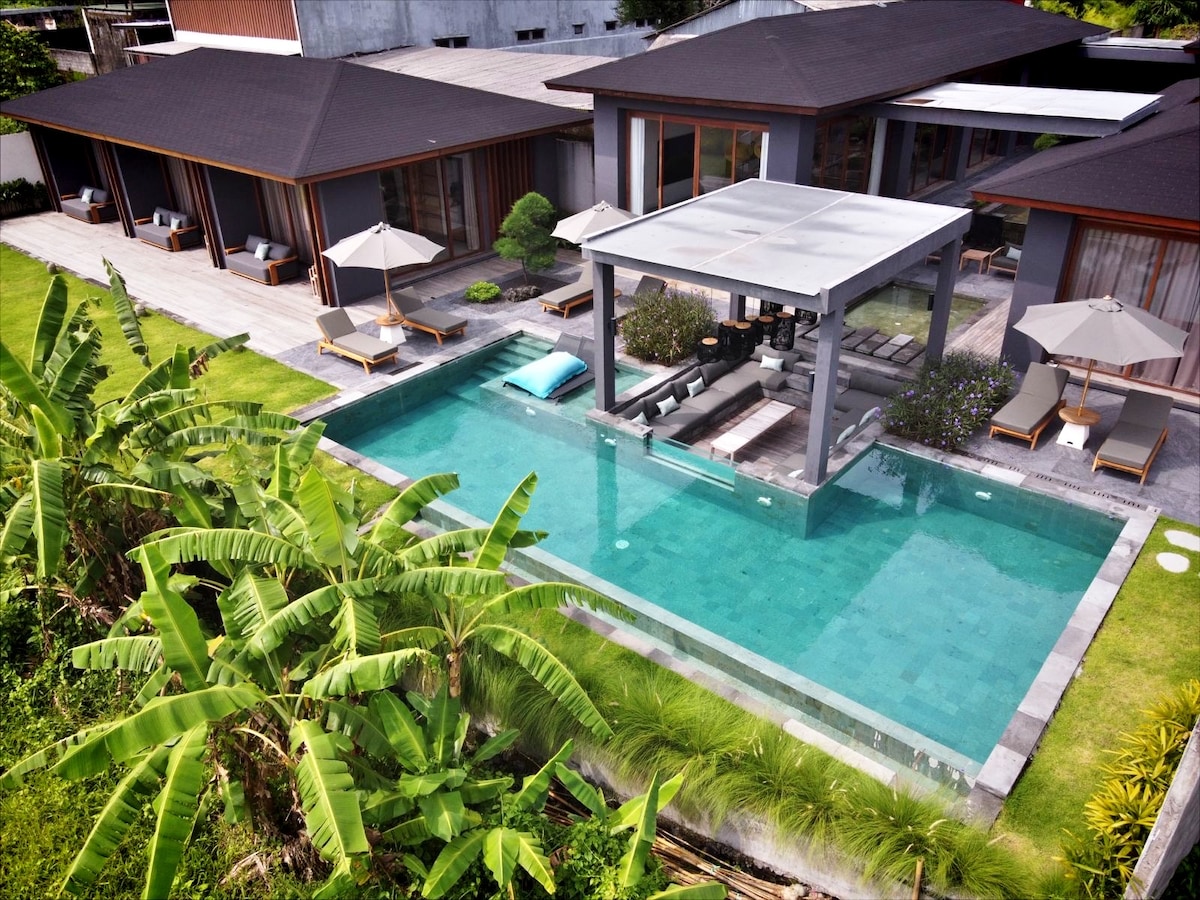 Shows: Aerial view of modern white villa with large pool, surrounded by tropical landscaping and rice fields in background