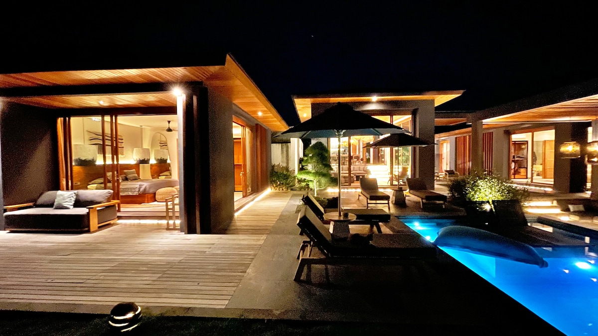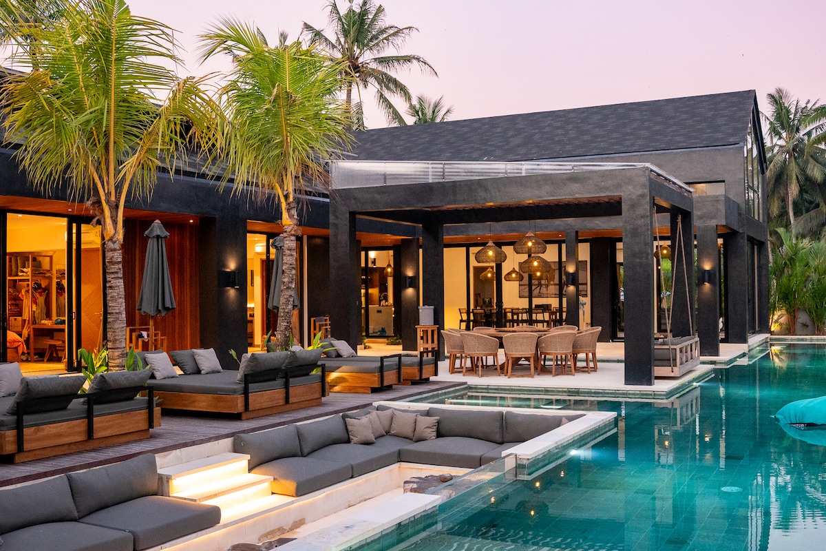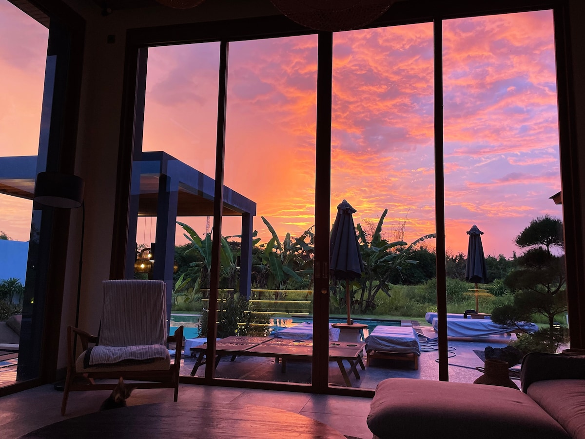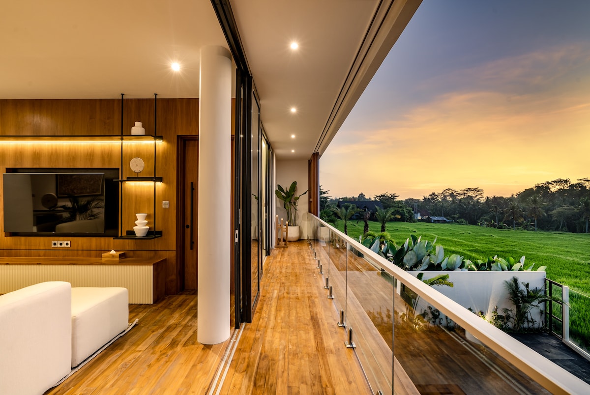Golden hour villa exterior with enhanced pool styling and rice field backdrop