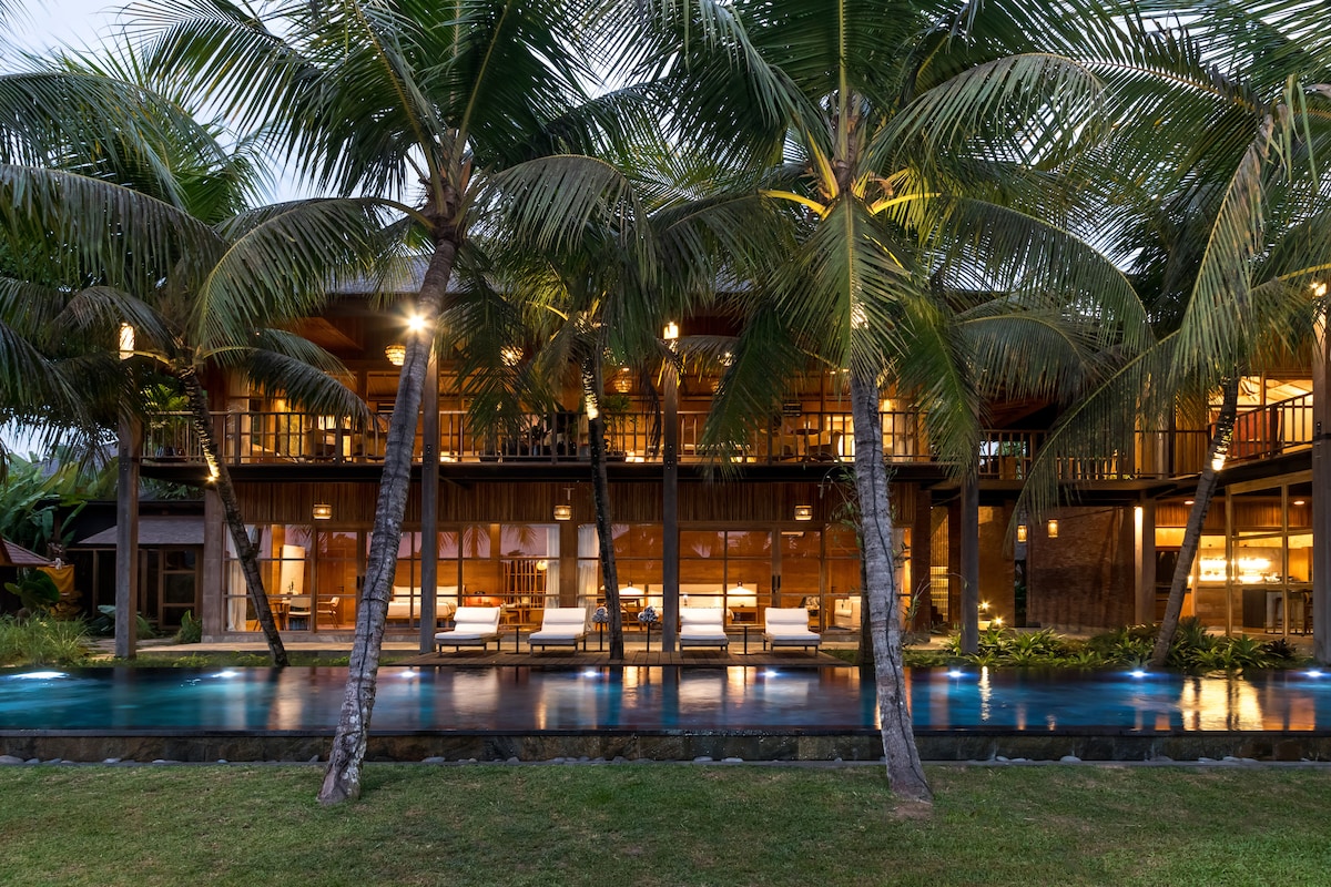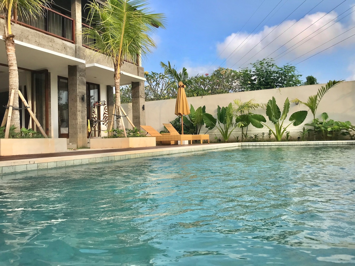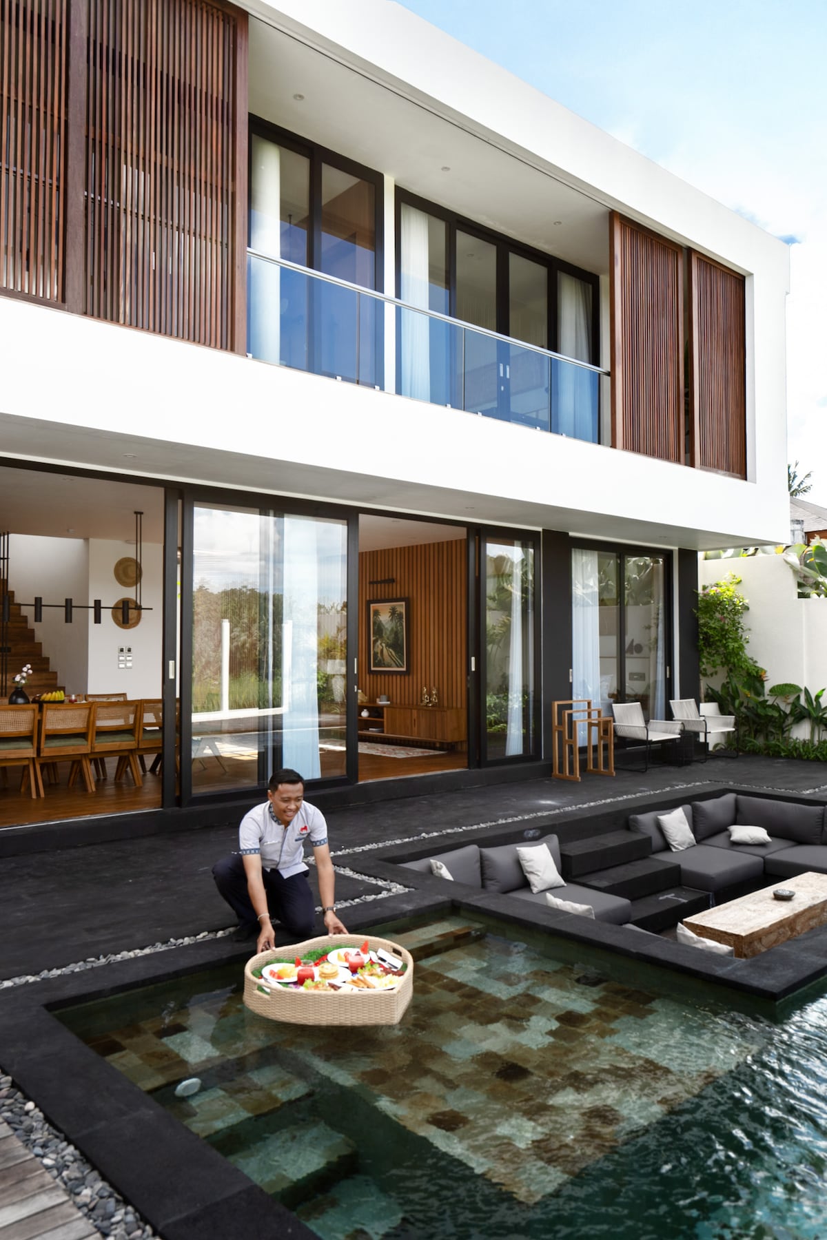 Golden hour villa exterior with enhanced pool styling and rice field backdrop