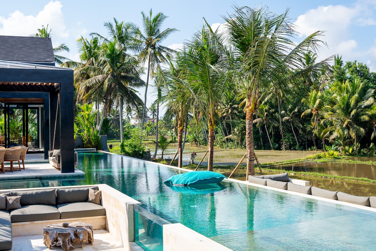 Shows: Infinity pool deck with loungers overlooking lush green rice fields, palm tree in foreground, captured during golden hour