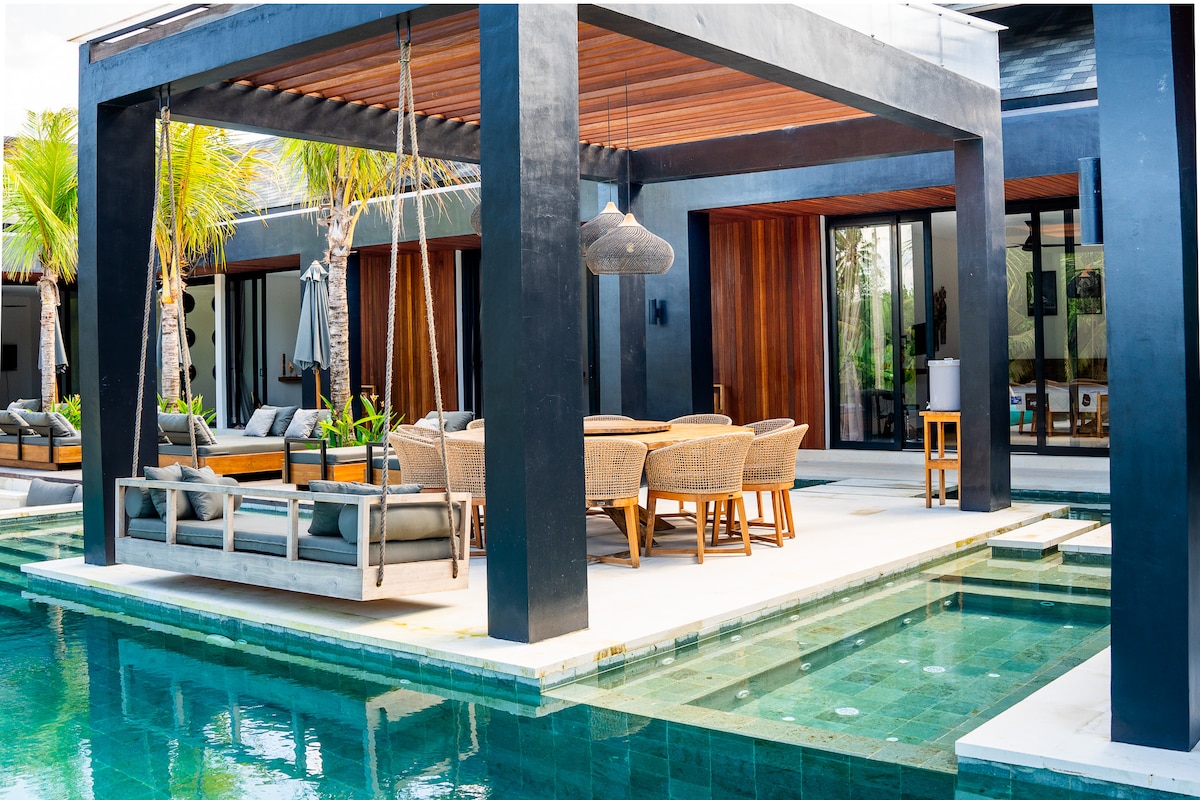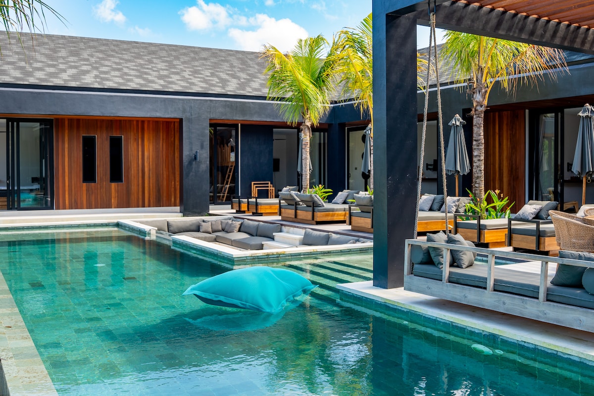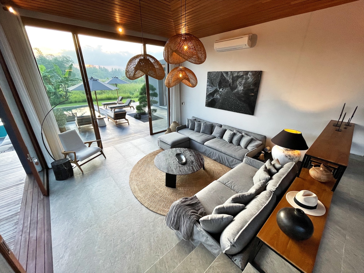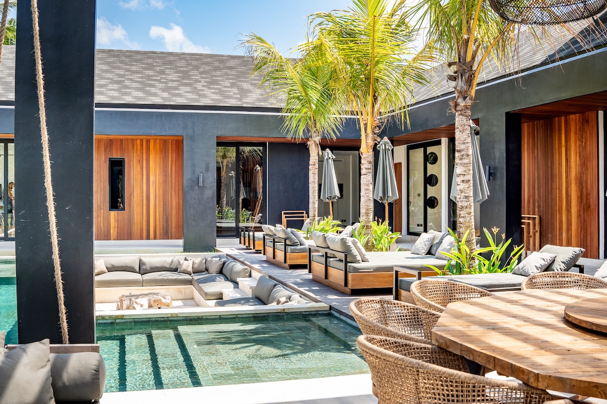 Shows: Modern open-plan living space with large grey sectional, wooden coffee table, and floor-to-ceiling windows opening to pool area